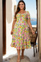 - Swoon at the beach wedding or garden party with this stunning dress designed to show off your feminine allure with its beautiful flowers and curves with a sexy deep V neck. Its flattering fit and flare cut, and billowing balloon sleeves that slims down the frame. Be the belle of the garden with